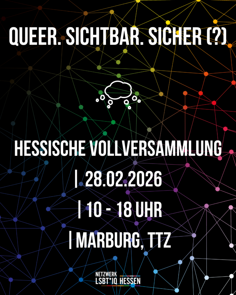 Am 28.02.2026 laden wir euch deswegen zu unserer zweiten queeren Vollversammlung nach Marburg ein. Unter dem Titel „Queer. Sichtbar. Sicher(?) – Vernetzung, Organisation und Handlungsfähigkeit in angespannten Zeiten“ wollen wir gemeinsam einen Raum schaffen, um uns zu vernetzen und über queere Sicherheit auszutauschen.